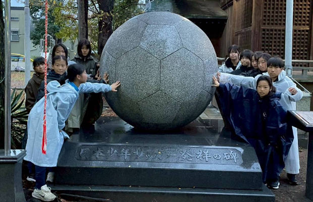 大きなサッカーボールの石碑と一緒に記念撮影!